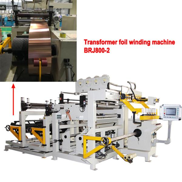 Transformer foil winding machine BRJ800-2 is one kind of copper or aluminium foil winders, i.e. Máquina de enrollar láminas, which is mainly used to make cast resin transformer coil. The transformer foil winding machine is driven by a 15kw motor.The transformer foil winding machine driven by the big power motor can handle one or two layers of copper or aluminium foil strip and one or two layers of insulation paper. With TIG welding unit, the foil and bus bar can be welded together. Burr removal unit and cleaning unit are driven by pneumatic. It is very easy to operate the transformer foil winding machine.